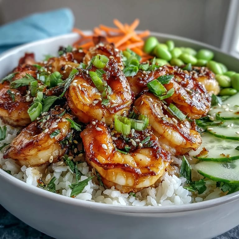 This bowl is best served immediately while the shrimp is still warm and the vegetables are crisp. For a complete dining experience, pair this meal with a crisp, cold white wine like a Sauvignon Blanc or a light ginger tea to complement the aromatic spices in the dressing.