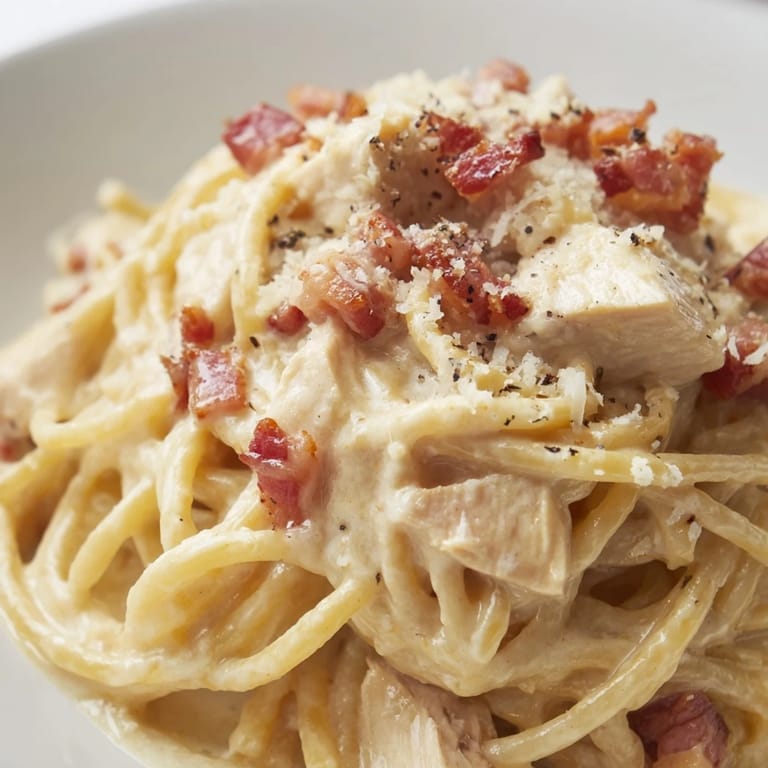 Pin It One Thursday evening, I stood in front of my fridge with leftover roasted chicken and half a pack of bacon, wondering what to make that wouldn't feel like leftovers. I'd been craving something creamy and indulgent, and suddenly carbonara came to mind—but with chicken instead of the usual guanciale. It felt a little unconventional, maybe even risky, but the moment I tossed that first forkful and tasted the silky Parmesan coating every strand of pasta, I knew I'd stumbled onto something special. Now it's my go-to whenever I need comfort in a bowl without spending an hour in the kitchen.