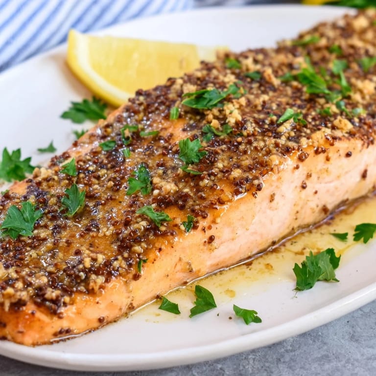 Pin It Succulent salmon fillets glazed with a tangy honey mustard sauce, broiled to perfection for a quick, flavorful weeknight meal.