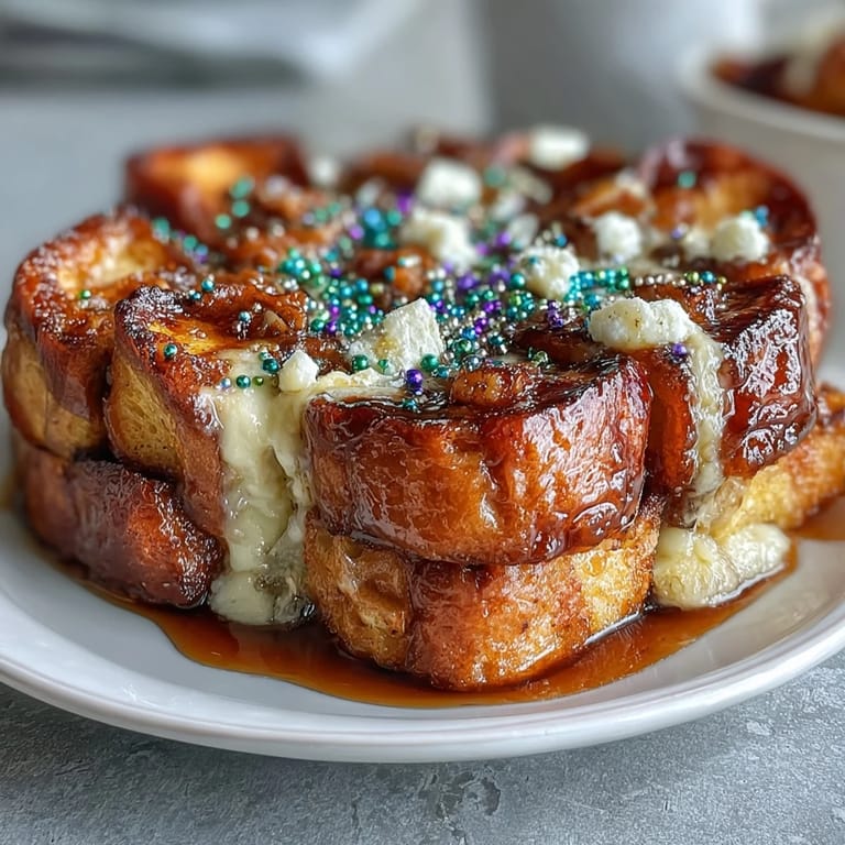 Pin It The beauty of this overnight bake lies in its simplicity and timing. The long soak in the refrigerator allows the custard to fully penetrate every cube of bread, ensuring each bite is rich, custardy, and perfectly sweet. The hidden layer of sweetened cream cheese adds a delightful surprise, melting into pockets of tangy richness that balance the sweetness beautifully. When you pull this golden, puffed casserole from the oven and drizzle it with vanilla icing before adorning it with those iconic purple, green, and gold sugars, you'll have created more than just breakfast—you'll have crafted an edible celebration that honors tradition while making memories around your table.