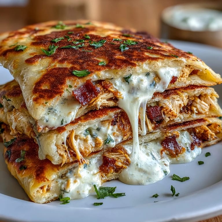 Pin It Imagine the warm, garlicky aroma of freshly toasted naan bread combined with the creamy tang of ranch-seasoned chicken. That's what you'll experience with this Ranch Crack Chicken Stuffed Naan. This American fusion dish takes the concept of a quesadilla and elevates it with soft garlic naan, creating a meal that's both comforting and exciting. The combination of sharp cheddar cheese melting around tender shredded chicken, all enhanced with the savory crunch of bacon bits, makes this a dish that will quickly become a family favorite.