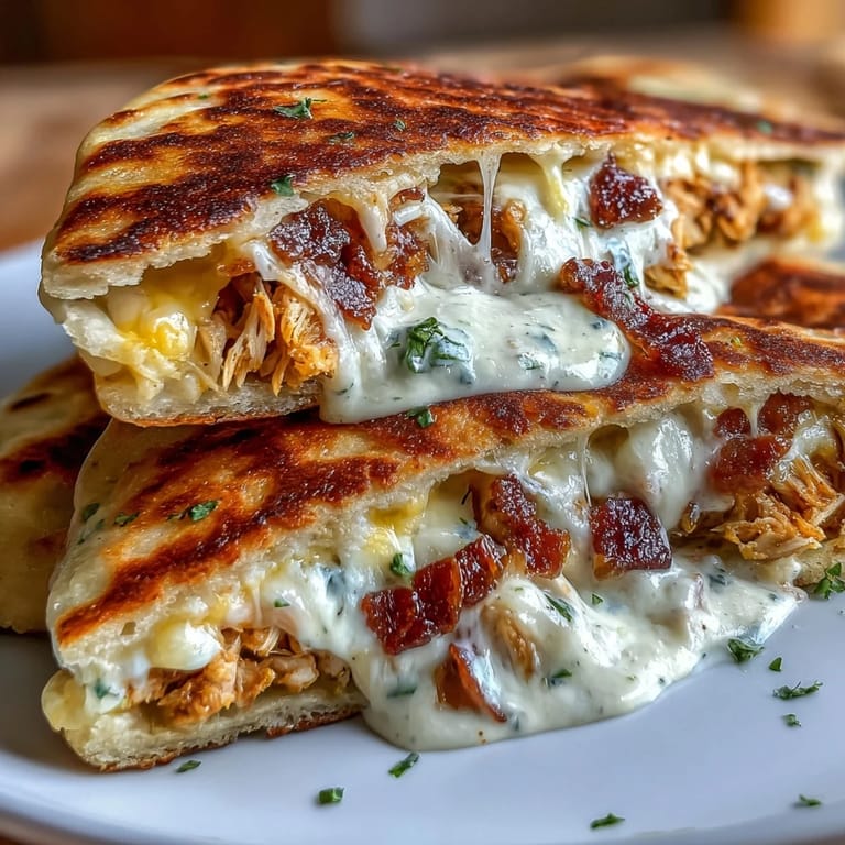Pin It The genius of this recipe lies in the combination of ranch seasoning with chicken - a pairing often nicknamed "crack chicken" because it's so addictively good. When sandwiched between garlic-buttered naan and grilled until golden, the result is a handheld meal that delivers satisfaction in every bite. The crispy exterior gives way to a molten interior where the cheese, chicken, and bacon create layers of flavor and texture.