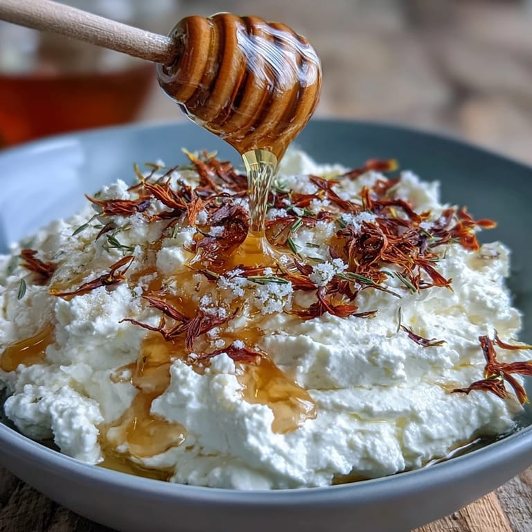 - Drizzle the salted honey generously over the whipped feta, letting it pool in the center. Then scatter your chosen garnish—edible flowers, thyme leaves, and a final whisper of lemon zest.