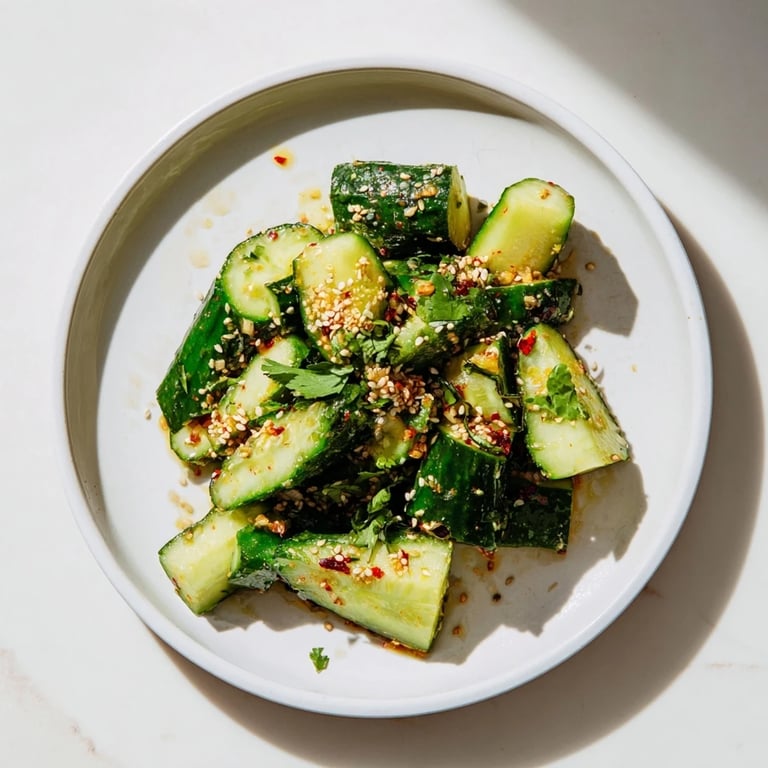 Pin It There's something almost meditative about the sound of a knife's flat side hitting a cucumber on a cutting board—that satisfying crack that tells you you're doing it right. I discovered this salad on a sweltering summer afternoon when my fridge was overflowing with cucumbers and I needed something cold and punchy to cut through the heat. What started as kitchen improvisation became the dish I now make whenever I want something that feels both light and dangerously addictive.
